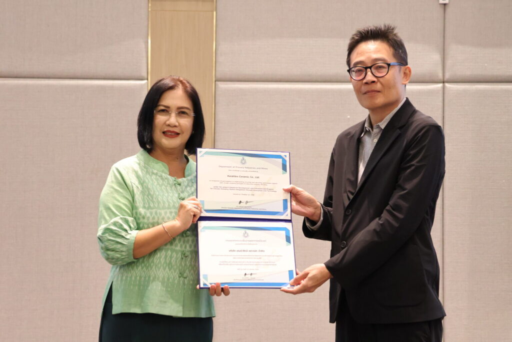 Ms. Araya Salaipetch, Deputy Director-General of the Department of Primary Industries and Mines (DPIM), presided over the seminar’s opening and presented certificates to entrepreneurs participating in the project to develop and enhance industrial capabilities, fostering stronger links to circular-economy markets through innovation and technology. During the address, Ms. Araya congratulated the participants. She expressed her appreciation to partner organizations, notably the National Metal and Materials Technology Center (MTEC) and the National Science and Technology Development Agency (NSTDA), for their sustained collaboration in advancing the project. She noted that these joint efforts play an essential role in assisting Thai industrial entrepreneurs to adapt and sustainably strengthen their competitiveness.