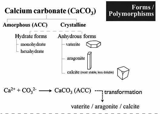 ที่มา: Sawada, K. 1997. The mechanisms of crystallization and transformation of calcium carbonates. Pure Appl. Chem. 69 (5): 921-928. รูปดัดแปรจาก Sikirić M.D. and Füredi-Milhofer, H. 2006. The influence of surface active molecules on the crystallization of biominerals in solution. Adv. Colloid Interfac. 128-130: 135-158.