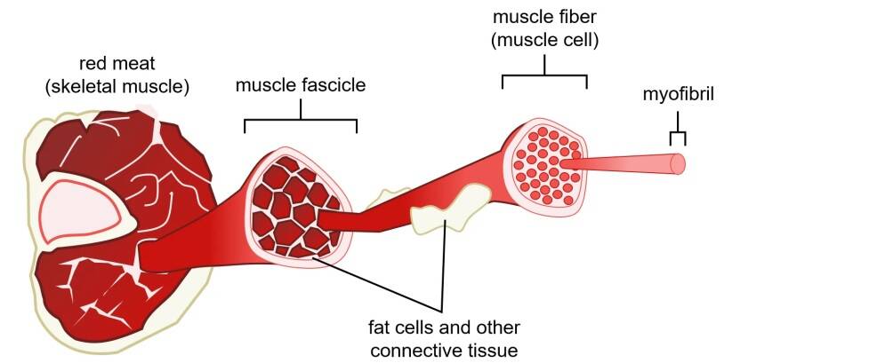 เนื้อสัตว์ประกอบด้วยไมโอไฟบริลขนาดเล็กมัดรวมกันเป็นมัดกล้ามเนื้อที่มีขนาดใหญ่ขึ้น