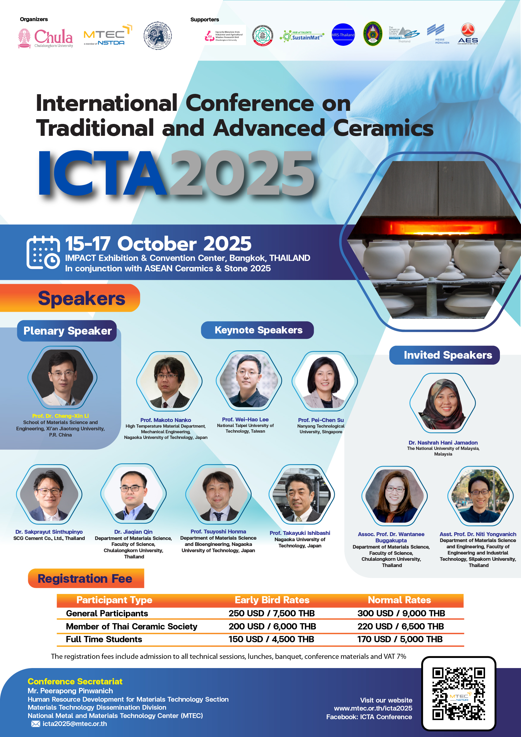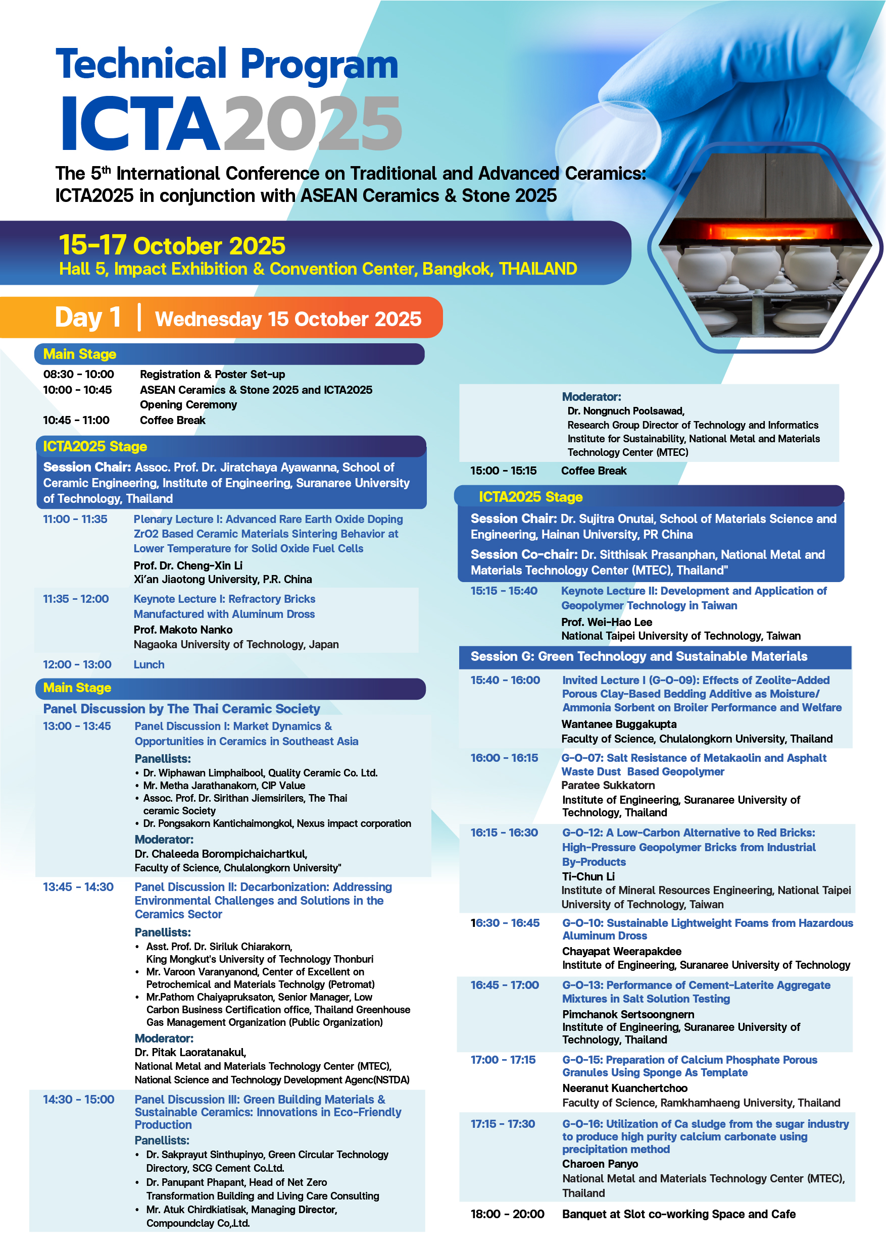 The International Conference on Traditional and Advanced Ceramics (ICTA) has been conducting a series of international conference since 2012. ICTA2025 is going to be held in conjunction with ASEAN Ceramics & Stone 2025 during 15-17 October 2025 at Impact Exhibition & Convention Center, Bangkok, THAILAND.