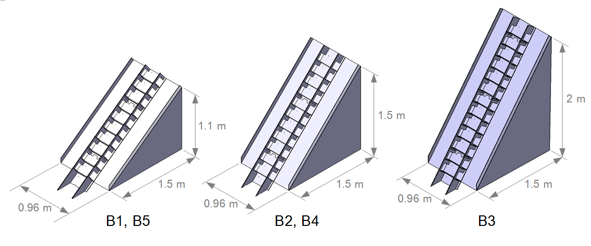 3.2 Slopes which are B1 to B5 located on top of the 40 mm field height,as shown in Figure 2. The medicine shelves are located on the slopes which are1 m width and 1.5 m depth. There are three different heights of the slopes, including 1.1, 1.5, and 2 m for B1 and B5, B2 and B4, and B3, respectively.