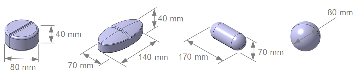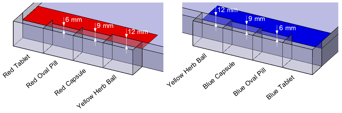 4.2 Pill sizes are shown in Figure 5.Atablet is 80 mm diameter and 40 mm thick. An oval pillis 70 mm width, 140 mm length, and 40 mm thick.A capsule is 70 mm diameter and 170 mm lengthand 70 mm thick. Anherb ballis 80 mm diameter.