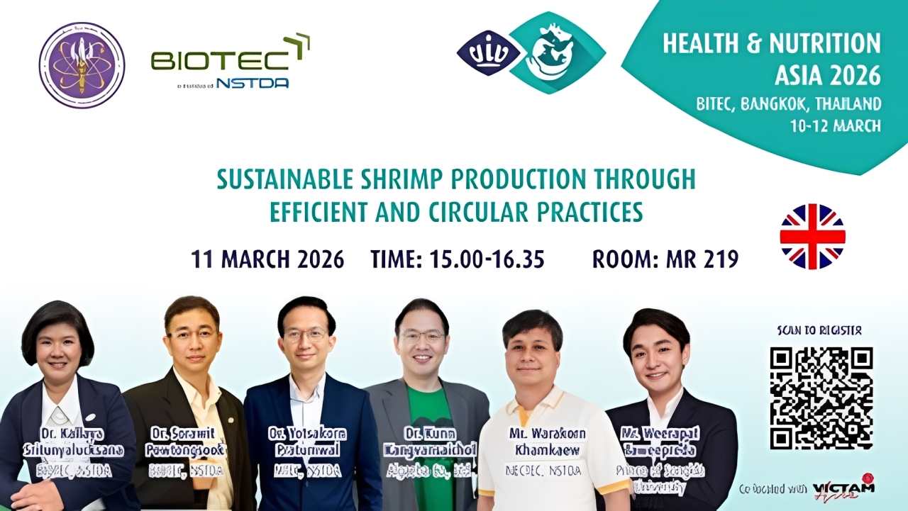 ศูนย์เทคโนโลยีโลหะและวัสดุแห่งชาติ สวทช. โดย ดร.ยศกร ประทุมวัลย์ (Senior Engineer และหัวหน้าทีมวิจัย) ทีมวิจัยคอมพิวเตอร์ช่วยในการคำนวณทางวิศวกรรม (CAE Research Team) ได้บรรยายหัวข้อ “Implementation of RAS Technology for Aquaculture Industry in Thailand” ภายใต้ Session “Sustainable Shrimp Production Through Efficient and Circular Practices” ในงาน Health & Nutrition Asia 2026 ซึ่งงานแสดงสินค้าและสัมมนาชั้นนำสำหรับธุรกิจ สุขภาพและโภชนาการสัตว์ในเอเชีย ที่จัดขึ้นระหว่างวันที่ 10–12 มีนาคม 2569 ณ ศูนย์นิทรรศการและการประชุมไบเทค กรุงเทพมหานคร https://healthandnutrition.viv.net/visit/conference-program