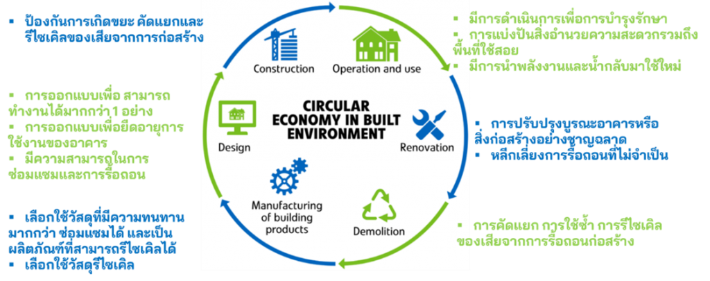 ภาคการก่อสร้างเป็นหนึ่งในภาคสำคัญของเศรษฐกิจและมีการบริโภคทรัพยากรธรรมชาติและสร้างของเสียมากที่สุด ของเสียจากการก่อสร้างและการรื้อถอนมีปริมาณสูงมาก ทั้งนี้เนื่องมาจากประเทศไทยมีการก่อสร้างโครงสร้างสาธารณูปโภคอย่างก้าวกระโดด แต่กลับพบว่าการจัดการขยะประเภทดังกล่าวอยู่ในระดับต่ำ ดังนั้นการนำหลักการ “เศรษฐกิจหมุนเวียน” มาประยุกต์ใช้จะสามารถช่วยให้เกิดการเปลี่ยนแปลงและการพัฒนาการจัดการขยะจากภาคการก่อสร้าง รวมทั้งการเพิ่มปริมาณและคุณภาพของการรีไซเคิลในอนาคต