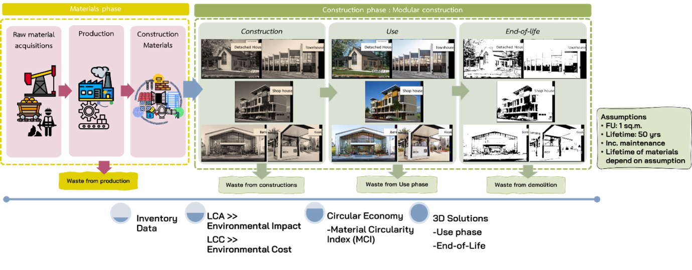 รูปที่ 3 กรอบการศึกษาเพื่อพัฒนาระบบเศรษฐกิจหมุนเวียนด้วยรูปแบบดิจิทัล (Digital Circular Solution) เพื่อประยุกต์ใช้ในระบบการก่อสร้างจากโครงสร้างเหล็กสำเร็จรูปตลอดวัฏจักรชีวิต