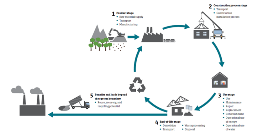 ความท้าทายในการสร้างความยั่งยืนของอุตสาหกรรมก่อสร้าง มีความเกี่ยวข้องต่อการเติบโตต่อผลผลิตมวลรวมของประเทศ การจัดการทรัพยากรที่ถูกนำมาใช้ รวมถึงการจัดการของเสียที่เกิดขึ้นทั้งระบบของอุตสาหกรรมก่อสร้างตลอดห่วงโซ่อุปทาน ตั้งแต่การได้มาซึ่งวัตถุดิบที่ใช้ในการก่อสร้าง การวางแผนและการออกแบบ ขั้นตอนการก่อสร้าง การเก็บรวบรวมของเสียที่เกิดขึ้น จนการนำวัสดุที่เหลือใช้กลับมาใช้ใหม่ อย่างคุ้มค่าและเกิดประสิทธิภาพสูงสุด ดังรูปที่ 1 ตามวัฏจักรการก่อสร้าง จึงมีการนำแนวคิดที่เรียกว่า แนวคิดเศรษฐกิจหมุนเวียน หรือ Circular Economy มาปรับใช้เพื่อนำไปสู่ความยั่งยืนในมุมของอุตสาหกรรมก่อสร้าง ช่วยแก้ปัญหาได้อย่างมีศักยภาพในหลายภาคส่วนเนื่องจากเกี่ยวข้องกับการใช้ทรัพยากรและพลังงานอย่างมีประสิทธิภาพมากขึ้นซึ่งนำไปสู่การลดของเสียและลดผลกระทบต่อสิ่งแวดล้อมของวัฏจักรผลิตภัณฑ์