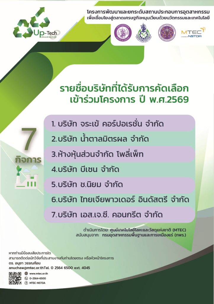 จากการจัดงานสัมมนา “Up-Technology for Circularity ยกระดับอุตสาหกรรมไทยด้วยนวัตกรรมและเทคโนโลยี Recycle/Upcycle” ในวันที่ 23 กุมภาพันธ์ 2569 ณ โรงแรม อัศวิน แกรนด์ คอนเวนชั่น บางเขน ที่ผ่านมา ทางโครงการฯ จึงได้พิจารณาคัดเลือกบริษัทที่จะเข้าร่วมในปีนี้ได้จำนวน 7 กิจการ ดังต่อไปนี้
